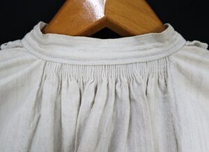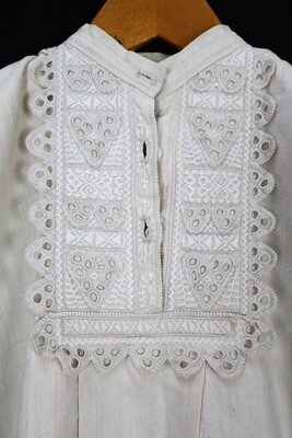 Aufgrund des schweren Leinenmaterials kann man davon ausgehen, dass die Bettjacke für kältere Jahreszeiten gedacht ist. Sie ist mit Lockstickerei an Ausschnitt und Ärmel dekoriert und hat eine recht einfache Form. Unter dem Arm wurden viereckige Zwickel eingenäht um die notwenige Bewegungsfreiheit zu gewährleisten. Der dicke Stoff ist am Halsausschnitt und am Ärmel in kleine Stiftelfalten gereiht, in der Vorderen Mitte unterhab des Plastrons schafft eine 9,5cm tiefe Kellerfalte mehr Volumen.