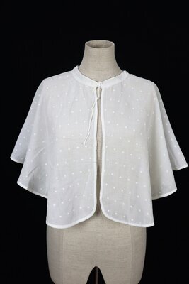 Weißes Capelet aus Rayon-Crepe mit dezentem Punktemuster. Das Cape ist unter dem Armen zusammengenäht.
