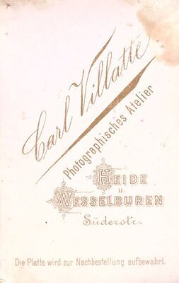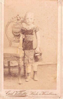 Zu sehen ist ein Mädchen von ca. zehn Jahren. Sie steht in einem Fotoatelier neben einem Stuhl. Mit der rechten Hand stützt sie sich am Sitz des Stuhles ab. In der Linken hält sie eine Tasche. Sie trägt eine kurzärmlige Bluse, die in der Mitte gerüscht ist. Der Rock ist ebenfalls gerüscht. Unter sem Foto sind der Name und der Sitz des Fotoateliers vermerkt.