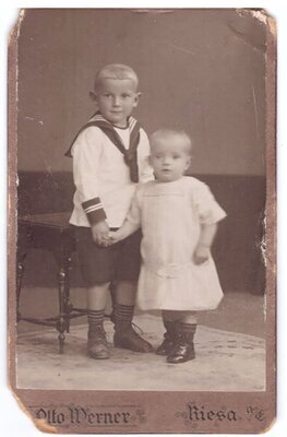 Zu sehen ist ein Junge von ca. zehn Jahren und ein kleineres Mädchen. Der Junge trägt einen Matrosenanzug Die wilhelminische Flottenpolitik führte zu einer symbolischen Wandlung des Matrosenanzugs. Mit dem Kleidungsstück wurde die Begeisterung für die Flotte ausgedrückt. Das Mädchen trägt ein langes Kleid und hohe Schuhe. Die beiden stehen voreinander und halten sich an der rechten Hand.