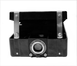 Unser Objekt ist ein kleiner Tischprojektor mit Namen Fafix, der Firma Zillmer Apparatebau . Objektiv: Fafix - Anastigmat 3,5/80, Fafix-Projektor. Ein sehr kompaktes Gerät -- Rahmengröße - Dia 24 x 36 - Maneller Bildwechsel Dia voben nach unten fallend? Der Gehäusedeckel hat inliegend eine 14 x 17 cm große Projektionsleinwand, so ohne weiteren Aufwand Bilder betrachtet werden können. Wir sind ziemlich sicher, dass unser Projektor für den Amerikanischen Markt produziert wurde. Die Stromversorgung von 110 Volt und die Projektorlampe von 110V/50 Watt aus amerikanischer Produktion sprechen dafür. Stomanschluss seitlich