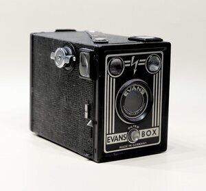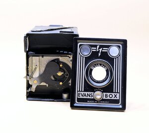 Unser Objekt ist eine Box Kamera von der Firma/Marke Evans. Die Box besitzt 2 Sucher, für Hoch- bzw. Queraufnahmen. Das Auslösen erfolgt über einen kleinen Hebel an der rechten Seite. Eine vorhandene Auslöseverriegelung verhindert eine unbeabsichtigte Belichtung. Die Auslösezeit ist fix auf 1/30s eingestellt. Das Negativformat beträgt 60 x 90 mm Die Box hat einen seitlichen Blitzanschluss und einen zuschaltbaren, eingebauten Gelbfilter. Interessant noch, der vordere Deckel lässt sich abnehmen, so dass die Verschlusstechnick sichbar wirs. (siehe Foro)