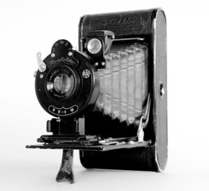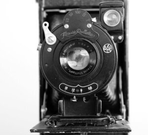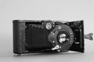 Unsere Krauss Rolette ist eine Balgkamera der Kamerafabrik Krauss aus Stuttgart. Der Fotoapparat ist aus Metall gefertigt und mit schwarzem Leder bezogen. Hergestellt wurde sie 1928 in einer sehr kompakten Bauweise, wozu auch das kleinere Bildformat 5 x 8 cm beitrug. Als "Westentaschenkamera" beworben, soll sie -lt. Hersteller- die ersta Kamera, mit diesem Format, in Deutschland gewesen sein. Das Objektiv ist ein Rollar Anastikmat 6,8 – 90mm Brennweite (KB-Äquivalent: 41,47). An Filmmaterial wurde ein Rollfilm benötigt, etwa der Agfa N6 oder der Kodak 129. Durch einfachen Druck auf den Knopf an der Oberseite, springt die Kamera auf, so dass das Objektiv mit dem Balg herausgezogen werden kann. Ausgrüstet ist der Apparat mit einem drehbaren Brilliantsucher für Hoch- bzw Queraufnahmen.