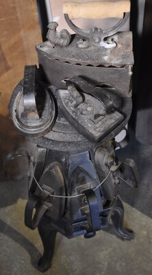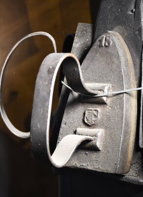 Einstöckiger Bügeleisenofen zur Erwärmung von 6 Bügeleisen. Bügeleisenöfen sind eine Erfindung des 19.Jahrhunderts. Unser Exemplar besteht aus einer achteckigen Brennkammer an deren glatten Aussenwänden Bügeleisen zum Erhitzen aufgehängt werden konnten. An unserem Ofen konnnten somit bis zu 8 Arbeiterinnen arbeiten, wobei jede ein zweites Bügeleisen zum Wechseln benötigte. Effizienter konnten Arbeiterinnen arbeiten, wenn sie mehrere Bügeleisen vom Ofen zur Verfügung hatten, diese häufig wechseln konnten und so eine gleichbleibende Wärme der Bügeleisen erreichen konnten. Die Brennkammer konnte durch eine relativ kleine Klappe an der Seite mit Brennstoffen - wahlweise Holz oder Kohle in sehr kleinen Stücken - befüllt werden. Oberhalb der Brennkammer befindet sich ein Aufsatz mit einer Kochplatte und dem Rauchabzug. Unter der Brennkammer befindet sich ein Raum der die relativ kleine Ascheschublade aufnimmt. Die Asche wird über schräg angeordnete Eisenbleche und einen (nicht mehr vorhandenen) Rost in die viel kleinere Aschenschublade gelenkt. Der kleine gusseiserne Ofen steht auf 3 geschwungenen Beinen und stand typischerweise auf einem drehbaren Tischchen, was den ständigen Wechsel der abgekühlten beziehungsweise aufgeheizten Bügeleisen für die Arbeiter erleichterte. Wenn auf den Bügeleisen Nummern zu sehen sind, kann das zwei verschiedene Gründe haben: Entweder war es eine Sortierung nach Gewicht (1-3 für den Haushalt, 4-7 für den professionellen Einsatz) oder sie waren einfach durchnummeriert, damit Arbeiterinnen leicht das am längsten aufgeheizte Eisen erkennen konnten. Die Bügeleisen an diesem Ofen dürften ursprünglich von verschiedenen Öfen stammen. Auf der Ascheschublage befindet sich die z.T. zerstörte Inschrift "N M??TIN" wahrscheinlich N MARTIN.Leider konnte diese bis jetzt keinem Hersteller zugeordnet werden.