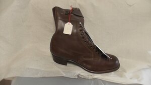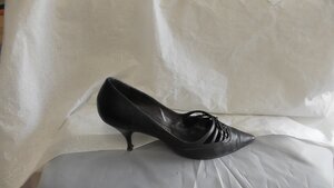 Ein Paar Schwarze Damen-Sandaletten aus Leder. Die Schuhe haben eine Runde Form, einen metallgenagelten Blockabsatz (mit Kugel im Absatz) und einen Plateau von 2 cm. Sie verfügen über zwei Riemen am Schuhblatt zum verschnüren hinten an der Verse, Leder oben an dem Schuhblatt vernäht und die Sohle ist metallgenagelt und Metall vorne an der Sohle. Zudem befindet sich vorne eine Zehenöffnung.
