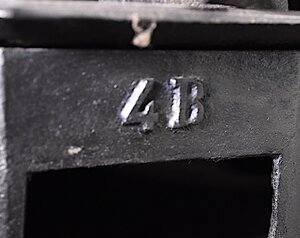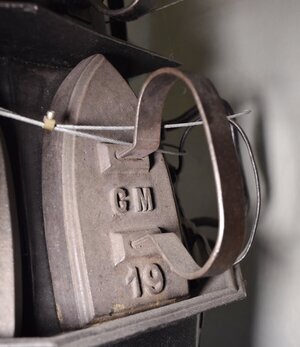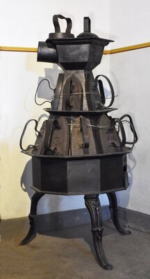 Zweistöckiger Bügeleisenofen zur Erwärmung von 14 Bügeleisen. Bügeleisenöfen sind eine Erfindung des 19.Jahrhunderts. Unser Exemplar besteht aus einer im unteren Stock achteckigen darüber sechseckigen Brennkammer an deren glatten Aussenwänden Bügeleisen zum Erhitzen aufgehängt werden konnten. An unserem Ofen konnnten somit bis zu 14 Arbeiterinnen arbeiten, wobei jede ein zweites Bügeleisen zum Wechseln benötigte. Effizienter konnten Arbeiterinnen arbeiten, wenn sie mehrere Bügeleisen vom Ofen zur Verfügung hatten, diese häufig wechseln konnten und so eine gleichbleibende Wärme der Bügeleisen erreichen konnten. Die Brennkammer konnte durch eine relativ kleine Klappe an der Seite mit Brennstoffen - wahlweise Holz oder Kohle in sehr kleinen Stücken - befüllt werden. Oberhalb der Brennkammer befindet sich ein Aufsatz mit einer Kochplatte und dem Rauchabzug. Unter der Brennkammer befindet sich ein Raum der die relativ kleine Ascheschublade aufnimmt. Die Asche wird über schräg angeordnete Eisenbleche und einen Rost in die viel kleinere Aschenschublade gelenkt. Der kleine gusseiserne Ofen steht auf 3 geschwungenen und verzierten Beinen mit Löwenfüßen und stand typischerweise auf einem drehbaren Tischchen, was den ständigen Wechsel der abgekühlten beziehungsweise aufgeheizten Bügeleisen für die Arbeiter erleichterte. Wenn auf den Bügeleisen Nummern zu sehen sind, kann das zwei verschiedene Gründe haben: Entweder war es eine Sortierung nach Gewicht (1-3 für den Haushalt, 4-7 für den professionellen Einsatz) oder sie waren einfach durchnummeriert, damit Arbeiterinnen leicht das am längsten aufgeheizte Eisen erkennen konnten. Oberhalb der Öffnung für die Ascheschublade befindet sich die Inschrift "4B", auf einem Blech vor der Ascheschublade die Inschrift ".EDERBR.ONN", welche auf die Eisenwerke Niederbronn (nördliches Elsaß) hinweist.