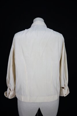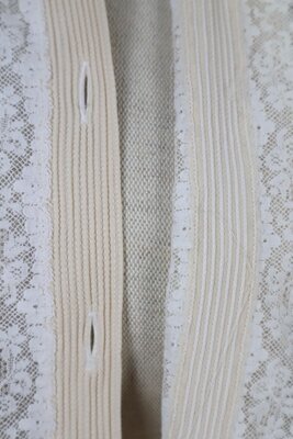 Apricotfarbene Bluse mit seitlichen Brustabnähern. Zur Dekoration sind am Vorderteil vertikal weiße Spitzenbänder aufgenäht, der Stoff dazwischen ist durch vertikale Nähte strukturiert. Geschlossen wird die Bluse mit Perlmuttknöpfen auf Metallbasis.