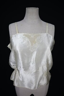 Untermend aus creme Satin. Das Hemd hat eine sehr simple Form und wird durch elastische Nähte an den Seiten auf die Figur gebracht. Am Ausschnitt befindet sich eine dekorative Stickerei und die obere Kante ist als Bogenkante verarbeitet.