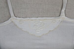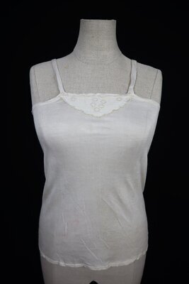 Cremefarbenes Unterhemd aus Maschenware mit dekorativer Stickerei am Aussschnitt. Lange Zeit wurde Unterwäsche in erster Linie aus gewebter Baumwolle oder Leinen gefertigt, die lose am Körper herunterhingen. Mit der Erfindung der maschinell hergestellten Maschenware wurde es möglich feine, körperanschmiegsame Wäsche zu produzieren. Dieser Trend hält bis heute an.