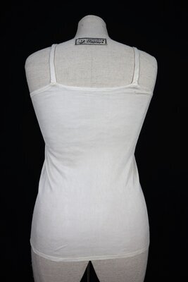 Cremefarbenes Unterhemd aus Maschenware mit dekorativer Stickerei am Aussschnitt. Lange Zeit wurde Unterwäsche in erster Linie aus gewebter Baumwolle oder Leinen gefertigt, die lose am Körper herunterhingen. Mit der Erfindung der maschinell hergestellten Maschenware wurde es möglich feine, körperanschmiegsame Wäsche zu produzieren. Dieser Trend hält bis heute an.