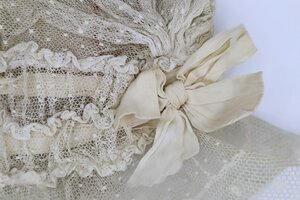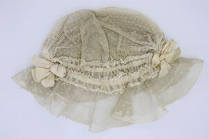 Nachthaube aus gepunktetem Baumwolltüll in creme. Die Haube ist gefüttert mit schlichtem Tüll und kann dank der durchgezogenen Satinbänder leicht verstellt werden. Die Bänder enden in dekorativen Schleifen.