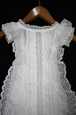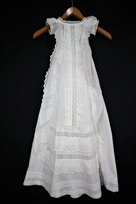 Reich verziertes mit Taufkleid mit Lochspitze aus Baumwolle. Das lange Kleid ist sehr formlos und kann hinten mit einer Schleife angepasst werden. Der Saum fällt bauschig dank der Verstärkung durch horizontale Biesen.