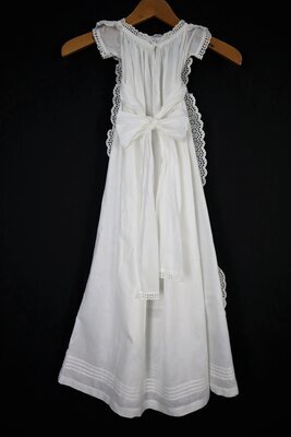 Reich verziertes mit Taufkleid mit Lochspitze aus Baumwolle. Das lange Kleid ist sehr formlos und kann hinten mit einer Schleife angepasst werden. Der Saum fällt bauschig dank der Verstärkung durch horizontale Biesen.