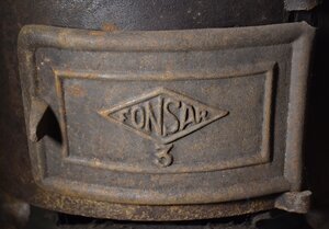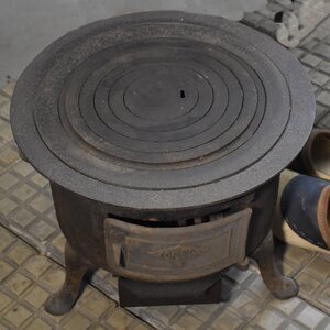 Ein so genannter Schützengrabenofen - gleichzeitig ein kleiner transportabler Kochherd im Freilichtmuseum Roscheider Hof. Der Ofen besitzt eine Aschentür, welche gleichzeitig Feuertür ist sowie an der Ofendecke Ofenringe zum Einhängen von Kochtöpfen und gleichzeitig zum Nachlegen von Brenngut. Schützengrabenöfen wurden vor allem im 1. Weltkrieg in den Schützengräben verwendet. Unser Exemplar ist ein runder, auf 3 Füßen stehender und transportabler Kochherd, der Platz für einen auch großen Kochtopf bot. Statt einer Herdplatte besitzt er ganz viele Ofenringe. An der Frontseite befindet sich eine Tür vor der der Brennkammer. Auf dieser befindet sich die Modellbezeichnung FONSAR 3 . Am Boden der Brennkammer befindet sich ein Rost. Beutzt man den Ofen ohne eine Aschkasten darunter zu stellen, fällt die Asche auf den Boden. Ähnliche Kleinstöfen gab es von der Ludwigshütte bei Biedenkopf (Hessen) um 1890 unter dem Namen "Armeleute-Ofen".