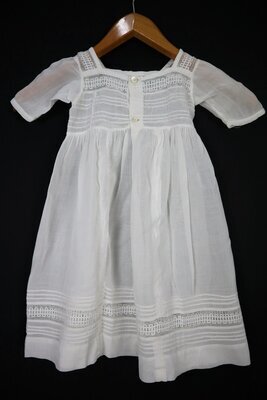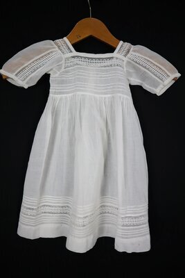 Das weiße Taufkleidchen ist dekoriert durch horizontale feine Biesen und Einsätze aus Filetspitze. Hinten schließt es mit 2 Perlmuttknöpfen.