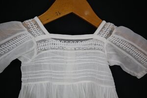 Das weiße Taufkleidchen ist dekoriert durch horizontale feine Biesen und Einsätze aus Filetspitze. Hinten schließt es mit 2 Perlmuttknöpfen.
