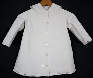 Dieser Kindermantel ist aus einem feinen Piqué mit Rautenmuster gefertigt. Er schließt vorne doppelreihig mit Perlmuttknöpfen und wird an Saum, Kragen und faux Ärmelaufschlägen mit einer Baumwollspitze mit Bogenkante geziert. Seitlich sind kleine Taschen aufgesetzt. Dank dem Aufhängeband innen ist das Mäntelchen leichter aufzuhängen.