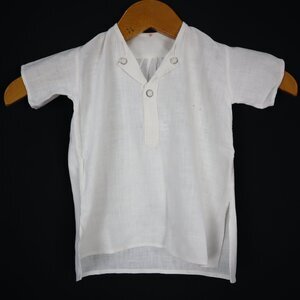 Leinenhemd für Kinder. Das Hemd ist sehr schlicht gehalten, es hat einen Kragen an dem zur Dekoration drei Wäscheknöpfe angenäht wurden. Innen isr ein Schild angebracht, dass die Größe als 45 ausweist. Hinten hat das Hemd eine Passe unterhalb der es leicht in Falten geleget ist um mehr Volumen zu erzeugen.