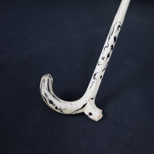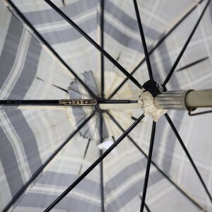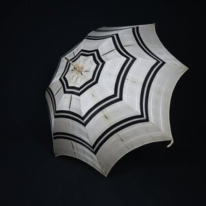 Dieser Flanierschirm ist mit schwarz-creme gestreifter Seide bespannt. Der L-förmige Holzgriff Griff wurde weiß angemalt und mit schwarzen Details im Jugendstil versehen die sich teilweise abgerieben haben. Im inneren Metallgestell ist der Name des Herstellers vermerkt: „K&R“.