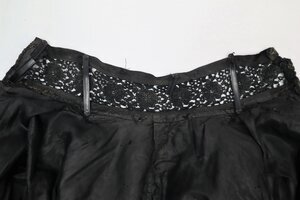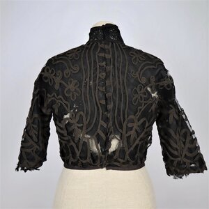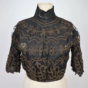 Bluse bestehend aus schwarzem Seidenfutter und Tüllstoff. Der grobmaschige Tull bestickt ist mit in floraler Form arrangierter braun-beiger Tresse bestickt. Vom Schnitt her ist die Bluse ausgesprochen simpel gehalten, es handelt sich um nur 2 Schnittteile da die Ärmel an das Fledermausärmel angeschnitten sind. Sie hat einen Stehkragen aus schwarzer maschinengemachter Nadelspitze der von innen durch Plastikstäbchen verstärkt ist- In der hinteren Mitte befindet sich der Druckknopf-Verschluss. Nur die mit Baumwollband eingefasste Taille schließt mit einem Haken, das ist nötig da an dieser Stelle sehr viel mehr Zug entsteht dem ein Druckknopf nicht standhalten könnte.