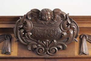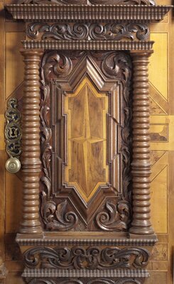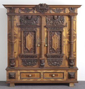 Der mit Intarsien und aufgesetztem Schnitzwerk versehene Schrank stammt aus dem Elsass und lässt sich anhand der geschnitzten Kartusche in der Mitte des Aufsatzes auf das Jahr 1710 datieren. Es handelt sich um einen spätbarocken, dreizonig gegliederten Fassadenschrank. Das Sockelgeschoss ist mit zwei Schubladen versehen, die an den Außenseiten von Löwenkopfapplikationen flankiert werden. Das Hauptfeld ist zweitürig und wird durch drei Säulen vertikal gegliedert. Die Säulen sind durchgängig aus Wülsten und Rillen zusammengesetzt und ruhen auf grotesken, an Darstellungen von Sphingen angelehnte Konsolbüsten. Die Türflügel zeigen jeweils mittig eine Sternintarsie, die von vegetabilem Schnitzwerk umrahmt und von gerillten Säulen flankiert wird. Unter den Mittelfeldern befinden sich Maskarons aus Akanthusranken, darüber Akanthusranken und geflügelte Engelsköpfe. Der Schrankaufsatz mit Gebälk und Gesims ist durch Tuchgehänge und Blüten und Engelsköpfen mit gekreuzten Flügeln sowie der mittigen Kartusche mit der Jahreszahl geschmückt. Die kufenartigen Füße sind wahrscheinlich sekundär. Der Schrank entspricht mit seinem architektonischen Aufbau, dem skulpturalen Schmuck und den ungewöhnlichen gerillten Säulen einem spezifisch elsässischen Typus, der sich annähernd über das gesamte 17. Jh. hinweg nachweisen lässt. Die Entwicklung vollzieht sich dabei zu immer reicherem und plastischerem Schmuck, wobei die einzelnen Schnitzelemente wie stereotyp vorgefertigt wirken. Die spätesten und am häufigsten erhaltenen Vertreter dieses Typus, dem auch der Schrank aus dem Historischen Museum der Pfalz angehört, wurden zwischen 1700 und 1710 angefertigt. [Johanna Kätzel]