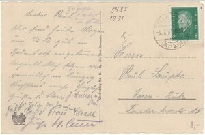 Karte im Querformat und im SW-Druck. Die Vorderseite zeigt einen Wasserfontaine vor einem buschigen Wald. Rechts im Bild sitzen Personen unter einem Baum. Die Karte wurde von einem Kurgast beschriftet und nach Eupen verschickt worden. Frankiert ist die Karte mit einer 8 Pfg-Marke Motiv Reichspräsident Friedrich Ebert. Vorderseite unter Bild "Bodendorf a. d. Ahr - Bodendorfer Thermalquelle" Rückseite: Senkrecht: "Großverlag Ka - Ro - Ba - Ne, Bad Neuenahr"