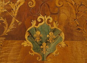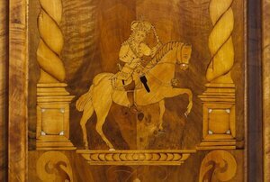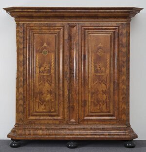 Der ursprünglich aus Landau stammende, zweitürige Schrank ist mit reicher Marketerie mit Details aus Perlmutt versehen. Die beiden Türfüllungen sind mit Bandelwerk und Akanthusranken sowie mit figuralen Darstellungen geschmückt: Links ist unter einer Kartusche mit den Lilien der Bourbonen, der französische König zu Pferde zu sehen und rechts, unter einer Kartusche mit dem Doppeladler, der deutsche Kaiser, ebenfalls zu Pferde. Die Herrscherdarstellungen werden von salomonischen Säulen flankiert. Der Überlieferung nach soll der Schrank 1743 in Landau als Meisterstück angefertigt worden sein. Dies entspräche der Vorliebe für den zweitürigen Kleiderschrank als Objekt für Meisterstücke im 18. Jh. Das für die erste Hälfte des 18. Jh. typische Bandelwerk unterstützt die Datierung. Die Gegenüberstellung des französischen und des deutschen Herrschers spiegelt sicherlich die wechselhafte Geschichte Landaus wieder, das durch mehrmalige Eroberungen und Rückeroberungen abwechselnd zu Frankreich und zum Heiligen Römischen Reich gehörte. Von der Form her stellt der Schrank einen in der Ausprägung etwas zurückgenommen Vertreter des so genannten Wellenschranks dar. Der gegen Ende des 17. Jh. in Frankfurt entwickelte Typus verbreitete sich um und nach 1700 rasch im gesamten Rhein-Main-Gebiet. Der Grundtypus ist ein zweitüriger Schrank ohne Schubladen in der Sockelzone und mit geradem Giebel. Anstelle architektonischer Gliederungen wie Säulen und Pilastern treten vertikale Wülste und Hohlkehlen. Sockel und Aufsatz erhalten horizontale Wellengliederungen. Die malerische Wirkung wird häufig noch durch eine starke Maserung des Furniers verstärkt. [Johanna Kätzel]