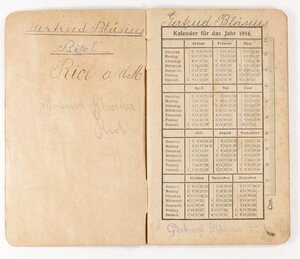 Auf der ersten Seite hat die ehemalige Besitzer handschriftlich ihren Namen und Adresse eingetragen: "Gertrud Bläsius aus Riol". Primär handelt es sich dabei um ein Notizbuch. Entsprechend sind die meisten Seiten leer um Platz für Notizen des Besitzers zu bieten. Auf einigen Seiten hat die Besitzerin ihre täglichen Ausgaben notiert. Außerdem befindet sich am Anfang ein Kalender des Jahres, in dem sämtliche Tage des Jahres und des Folgejahres mit den entsprechenden Wochentagen verzeichnet sind. Zusätzlich befinden sich auch weitere nützliche Informationen darin wie eine Übersicht über die Feiertage und die Postgebühren.