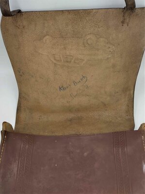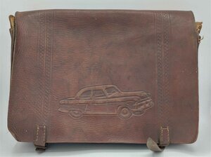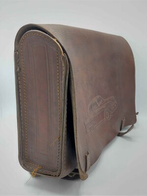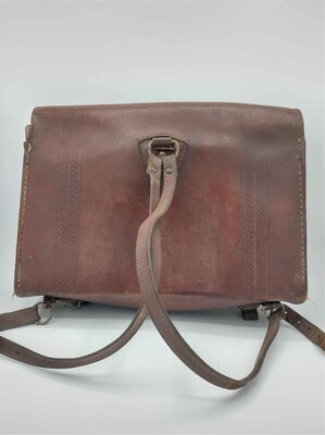 Die Schultasche, oder auch der Schulranzen ist aus dunkelbraunem Leder gefertigt und sie besitzt auf Vorderseite ein ins Leder geprägtes Auto-Motiv. Der Deckel der Tasche wird mit zwei Schnallen am unteren Rand der Vorderseite geschlossen und die Träger sind auf der Rückseite mittig befestigt. Am Boden der Tasche sind sie auf der einen Seite mit einer Schnalle befestigt und auf der anderen Seite kann der Träger einfach ein- und wieder ausgehängt werden. So ließ sich die Tasche leichter an- und wieder ausziehen. Der Innenraum der Tasche besteht aus einem einzigen großen Fach. Auf der Innenseite des Deckels steht mit Kugelschreiber der Name Klaus Busch geschrieben und darunter Roscheid. Klaus Busch kann dabei der Name des ehemaligen Besitzers sein, während Roscheid den Stadtteil von Konz bezeichnet, in dem sich das Freilichtmuseum Roscheider Hof befindet. Es finden sich keinerlei Prägungen oder Aufkleber, die einen Hinweis auf den Hersteller geben.
