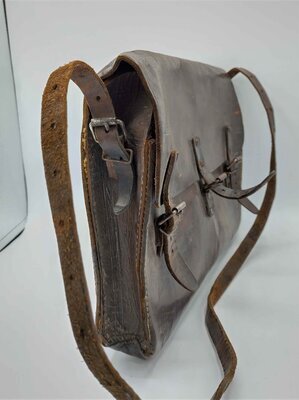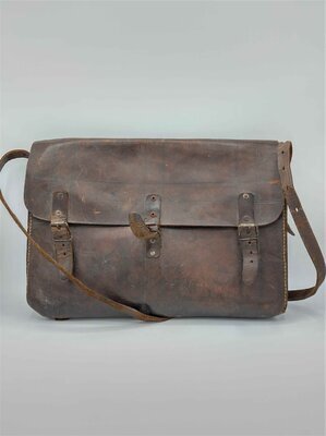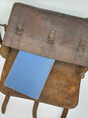 Die Schultasche, oder auch der Schulranzen ist aus dunkelbraunem Leder gefertigt. Sie besitzt vorne drei Schnallen, an denen der Deckel geschlossen werden kann. Die Schultasche kann nicht wie die meisten Schultaschen auf dem Rücken getragen werden, denn sie besitzt einen Schultergurt, der an den Seiten der Tasche befestigt ist. Die Tasche besitzt ein mittlerweile nicht mehr ganz so gut zu erkennendes kariertes Muster. Auf der Innenseite des Deckels steht die Nummer 540-82. Dabei handelt es sich vermutlich um eine ehemalige Inventarisierungsnummer. Der Innenraum der Tasche besteht aus einem einzigen Fach. Es ist keinerlei Prägung oder Ähnliches vorhanden, das Aufschluss über einen möglichen Hersteller gibt. Anmerkung: Auf einem der Bilder ist ein blaues Buch zu sehen, dieses war nicht in der Schultasche enthalten, sondern wurde genutzt, um den Deckel der Tasche für das Bild offen zu halten.