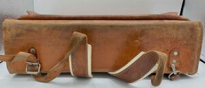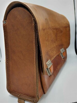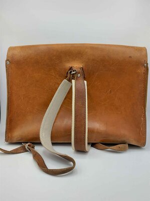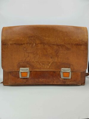 Die Schultasche, oder auch der Schulranzen ist aus hellbraunem Leder gefertigt. Sie ist hauptsächlich vernäht, aber am oberen Rand der Seitenteile lassen sich jeweils vorne und hinten metallene Nieten finden. Sie besitzt vorne zwei Schnapp-Schnallen, die mit eckigen orangenen Reflektoren kombiniert sind und an denen der Deckel der Tasche festgemacht werden kann. Der Deckel der Tasche ist mit einem eingeprägtem Pferdemotiv versehen. Auf der Rückseite sind die zwei Träger mittig befestigt, sie sind an dem Boden der Tasche auf der einen Seite mit einer Schnalle befestigt und auf der anderen Seite kann der Träger einfach ein- und wieder ausgehängt werden. So ließ sich die Tasche leichter an- und wieder ausziehen. Des Weiteren bestehen die Träger nicht nur aus einfachen Riemen, sondern sie sind mit einem zusätzlichen breiten Lederstreifen vernäht, dessen weiche Seite sozusagen "nach Innen" gerichtet ist und so vermutlich als Schulterpolster fungiert hat. Der Innenraum der Schultasche besteht aus einem einzigen Fach und man kann dort erkennen, dass die Seitenteile der Tasche mit hartem, schwarzen Karton verstärkt sind. Der Boden der Tasche ist ebenfalls mit Karton verstärkt. Vorne an der Tasche befindet sich noch eine schmale Tasche, in der Hefte oder ähnliche schmale Dinge transportiert werden konnten. Vorhanden war jedoch ein Setz aus gebastelten Papierfiguren. Es sind keinerlei Prägungen oder Ähnliches vorhanden, was Aufschluss über den Hersteller geben könnte.