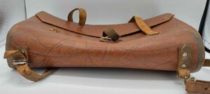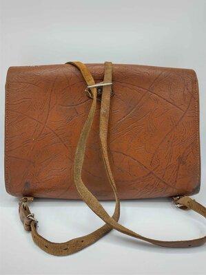 Die Schultasche, oder auch der Schulranzen ist aus hellbraunem Leder gefertigt und besitzt ein Muster aus geraden, senkrechten Linien, welche keiner erkennbaren Richtung folgen. Vorne in der Mitte konnte der Deckel an einer Schnalle festgemacht werden, die Träger waren am Boden der Tasche auf der einen Seite mit einer Schnalle befestigt und auf der anderen Seite kann der Träger einfach ein- und wieder ausgehängt werden. So ließ sich die Tasche leichter an- und wieder ausziehen. Die Schnallen auf Vorder- und Unterseite der Tasche sind jedoch kaputt. Besonders an dieser Tasche war, dass die Träger nicht auf der Rückseite der Tasche festgemacht waren, sondern dort lediglich durch einen metallenen Ring gezogen sind und über den Deckel der Tasche hinaus gehen, wo sie auf der Vorderseite der Tasche, in Höhe der Deckelschnalle rechts und links festgenäht waren. Das bedeutet, dass die Träger, erst immer nach rechts und links vom Deckel heruntergenommen werden mussten, damit der Deckel geöffnet werden konnte. Der eine Träger ist allerdings abgerissen. Der Innenraum der Schultasche besteht aus einem einzigen Fach. Es sind keinerlei Prägungen oder Ähnliches vorhanden, was Aufschluss über den Hersteller geben könnte.