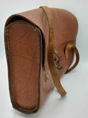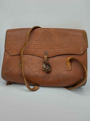 Die Schultasche, oder auch der Schulranzen ist aus hellbraunem Leder gefertigt und besitzt ein Muster aus geraden, senkrechten Linien, welche keiner erkennbaren Richtung folgen. Vorne in der Mitte konnte der Deckel an einer Schnalle festgemacht werden, die Träger waren am Boden der Tasche auf der einen Seite mit einer Schnalle befestigt und auf der anderen Seite kann der Träger einfach ein- und wieder ausgehängt werden. So ließ sich die Tasche leichter an- und wieder ausziehen. Die Schnallen auf Vorder- und Unterseite der Tasche sind jedoch kaputt. Besonders an dieser Tasche war, dass die Träger nicht auf der Rückseite der Tasche festgemacht waren, sondern dort lediglich durch einen metallenen Ring gezogen sind und über den Deckel der Tasche hinaus gehen, wo sie auf der Vorderseite der Tasche, in Höhe der Deckelschnalle rechts und links festgenäht waren. Das bedeutet, dass die Träger, erst immer nach rechts und links vom Deckel heruntergenommen werden mussten, damit der Deckel geöffnet werden konnte. Der eine Träger ist allerdings abgerissen. Der Innenraum der Schultasche besteht aus einem einzigen Fach. Es sind keinerlei Prägungen oder Ähnliches vorhanden, was Aufschluss über den Hersteller geben könnte.