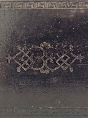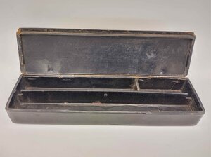 Die Griffeldose, auch als Griffelkasten bekannt, ist aus schwarz lackiertem Holz gefertigt. Der Deckel der Dose ist mit einer filigranen Musterung versehen und kann einfach aufgeklappt werden. Der Innenraum der Griffeldose ist in drei Fächer aufgeteilt, ein langes Fach, in dem sich noch ein metallener Deckel eines Federhalters befindet, ein mittellanges Fach und ein kurzes Fach. Die Griffeldose besitzt keinerlei Prägung, die einen Hinweis auf den Hersteller gibt.
