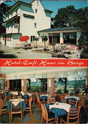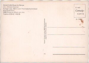 Karte im Hochformat und im Bunt-Druck und gewelltem Rand. Vorderseite: Das Bild zeigt oben die Außenansicht mit Terrasse und unten den Gastraum mit gedeckten Tischen und Blick ins Ahrtal. Der Name des Hauses ist in einem roten Band in weißer Schrift eingefügt. Mitten auf der Karte "Hotel-Café Haus im Berge" Rückseite: Oben links " Inh.: Christel Sternad Ruhige Lage, 800 m vom Thermalschwimmbad Bad Bodendorf 5485 Sinzig an Rhein und Ahr Telefon 02642 / 41635". Senkrecht "PO Robert Cornely Verleg Bad Wörishofen jeglicher Nachdruck verboten" Im Briefmarkenfeld "EINE Cornely-KARTE Nr. 12847 H"