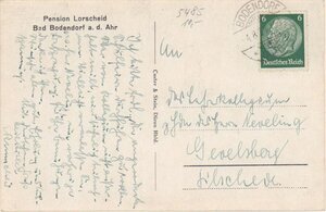 Karte im Hochformat und im SW-Druck. Die Vorderseite zeigt 2 Bilder, in einem weißen Rahmen eingebettet, oben die Straßenansicht der Pension Lohrscheid und unten einen Blick in den Speisesaal. Rückseite: Oben links "Privat-Pension HAUS HOLLEND Inh. E. Schöer-Verheyen BAD BODENDORF a. d. Ahr In nächster Nähe der Bäder und des Sprudels" und mittig Senkrecht "Photohaus Dornbach & Elfgang, Bad Neuenahr, Hans-Kerrl-Str. 10 Ges. ge Die Karte wurde von einem Kurgast beschriftet und nach Gevelsberg verschickt worden. Frankiert ist die Karte mit einer 6 RPfg.-Briefmarke Motiv Reichspräsident Hindenburg.