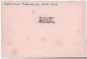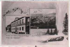 Karte im Querformat und SW-Druck Vorderseite: Vier Bildelemente. Von Links Bild Gasthaus zum Rhein u. Ahrtal von H. Bauer , Mitte Dorfbild und rechts sprudelnde Quelle zwischen Tannenbäume. Unter dem linken Bild „Gasthaus zum Rhein u. Ahrtal von H. Bauer", "darunter Gruß aus Bodendorf“. Rückseite: Handschriftlich oben links "Repro einer Postkarte vom 14.8.1916". Mittig Stempel "Gasthaus Bauer, Inh. Reinhild Bauer, 5xx5 Bad Bodendorf, Hauptstraße 52, Telefonnummer