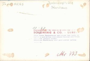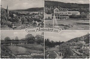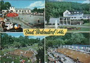Karte im Querformat und Bunt-Druck. Die Aufnahme ist in Bunttönen coloriert und zeigt im Vordergrund einen Springbrunnen, dahinter die Trinkhalle mit Wandelgang und im Hintergrund das Kurhaus St. Josef-Sprudel. Rückseite: Oben links handschriftlich "Fre col 55/63"; oben rechts "Bodendorf/Ahr Kurhaus" Mitte rechts handschriftlich "10 - 68" und Stempel "Honorarpflichtig! Bei Abdruck ist unbedingt zu ......; SCHÖNING & CO; Ohne unsere Genehmigung darf dieses Foto weder vervielfältigt noch an dritte, unberufene Personen oder Firmen zugänglich gemacht werden. Nachbildung wird strafrechtlich verfolgt. Archiv Nr." und handschriftlich unter rechts "Ahr 773"