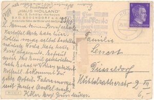 Karte im Querformat und im SW-Druck. Die Vorderseite zeigt vor einem Haus Liegestühle in einer kleinen Gartenanlage. Rückseite: Oben links "Privat-Pension HAUS HOLLAND Inh. E. Schöer-Verheyen BAD BODENDORF a. d. Ahr In nächster Nähe der Bäder und des Sprudels" und mittig Senkrecht "Photohaus Dornbach & Elfgang, Bad Neuenahr, Hans-Kerrl-Str. 10 Ges. gesch." Die Karte wurde von einem Kurgast beschriftet und nach Düsseldorf verschickt worden. Frankiert ist die Karte mit einer 6 RPfg-Briefmarke Deutsches Reich mit Motiv Hitler.