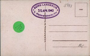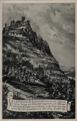 Karte im SW-Druck. Blick aus dem Tal auf die Burg Landskrone, wie sie sich 1204 ausgesehen haben soll. Im Bild unten eine Textfahne mit Beschreibung zur Burg. Unten mittig im Bild "Mit der Erbauung der Burg Landskrone wurde 1204 von Kaiser Philipp von Schwaben begonnen, um 1208 von König Otto IV. erobert und vollendet, in der Folge von mehreren Besitzern gewechselt und 1682 völlig zerstört" Rückseite mittig senkrecht "Ka-Ro-Ba-Ne-Verlag, Bad Neuenahr/Rhld." Auf der Rückseite ein blauer ovaler Stempel mit Text "Burg Landskron b. Heimersheim*Ahr" und dem Datumsstempel 30.Apr.1940"