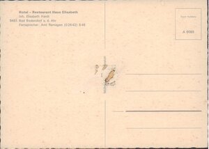 Karte im Querformat, Rand ist gezackt und im Bunt-Druck. Vorderseite: Das Bild zeigt das Hotel von der Seite (Giebel) aus aufgenommen. Vor dem Gebäude eine Straße und rechts neben dem Gebäude ein Wohnhaus. Rückseite: Oben links "Hotel - Restaurant Haus Elisabeth - Inh. Elisabeth Hardt - 5481 Bad Bodendorf a. d. Ahr - Fernsprecher: Amt Remagen (....)"; rechts: als Briefmarkenfeld "Echt Farbfoto A 6089". Senkrecht "Mohn Druck, Gütersloh"