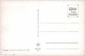 Bild im Querformat und schwatz-weiß. Das Bild ist im Anflug von Süden aus einer Höhe von ca. 200 m aufgenommen. Im Vordergrund die Bundesstraße von Ost nach West verlaufend. Links die Mineralwasserfabrik Bodendorfer Sprudel, rechts daneben Feld und anschließend der Friedhof. Im Folgenden rechts Wohnbebauung bis zum Bildrand. Im mittleren Bildfeld rechts der Ortskern und nach links in Einzelbebauung übergehend. Vor dem hinter dem Ort liegenden abfallenden Hängen sind vereinzelt noch Weinberge erkennbar. Beschriftung unter Bild: Unten links "Bad Bodendorf/Ahr" und rechts "Cekade Luftbild" Rückseite: Unten links: "Freigeg. d. Reg.-Präs. Münster Cr. 6171" Senkrecht "Bon 04362/1 Agfa Jupp Schuld, Bad Bodendorf (Ahr)" Im Briefmarkenfeld "Cekade Originalfotos" und handschriftlich "320"