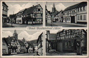 Karte im Querformat und im SW-Druck Die vier Bilder sind in einem weißen Rahmen eingefasst. Bild oben links Fachwerkhaus neben Aufgang zur Kirche, dahinter Pension „Wie daheim“; Oben rechts Auto in der Straßenenge „Oberes Tor“, unten links Blick Richtung Pfarrhaus und auf Pension „Wie daheim“; unten rechts Brunnen am Dorfplatz. Mittig in Rahmen "Bad Bodendorf/Ahr" Rückseite: Mittig Senkrecht: "Photohaus Dornbach & Elfgang, Bad Neuenahr, Hanns-Kerrl-Str. 10 und Kurkolonnade 5"; oben links handschriftlich in Rot "In den 30er Fachwerk dominiert im Straßenbild (Hauptstraße)"; unten links im Rahmen "Bromid"