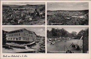 Karte im Querformat und im SW-Druck. Die vier Bilder sind in einem weißen Rahmen eingefasst. Oben werden zwei Gesamtansichten des Dorfes, links vom Reisberg und rechts vom Mühlenberg, und unten links das Kurhaus/Kurhotel und rechts das Schwimmerbecken im Thermalschwimmbad gezeigt. Unten links "Gruß aus Bad Bodendorf a. d. Ahr" Rückseite: Mittig Senkrecht: "Ka-Ro-Ba-Ne-Großverlag, Bad Neuenahr/Rhld. - Nr. 717". Die Karte ist von einem Gast beschrieben und am 13.10.1954 mit Bahnpost nach Krefeld verschickt worden.