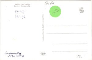 Karte im Querformat und im SW-Druck. Die Vorderseite zeigt mit zwei Bilder die Straßen- und Hofansicht der Privatpension. Vorderseite: "Wie Daheim" und Deine Privatpension in Hurbad Bodendorf 35" Rückseite: Oben links "Inhaber Otto Simons Tel. Amt Remagen 765" Senkrecht "Foto Jupp Schuld, Bad Bodendorf/Ahr"