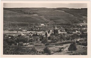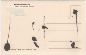 Karte im Querformat und schwarz-weiß-Druck. Das Bild ist in einen fünf mm breiten weißen Rahmen eingefasst. Im Vordergrund Weinberge und ein Erdbeerfeld. Der Mittelteil beginnt mit dem Ort, dazwischen das Ahrtal und vor dem Wald, Mühlenberg das Kurhaus St. Josefs-Sprudel. Rückseite: Links oben "Kurbad-Bodendorf/Ahr / Gesamtansicht mit Blick auf das Kurhaus"; unten links "Foto-Bild-Verlag GmbH, Bonn, Bestell Nr. E1637"; "Mittig senkrecht "Jupp Schuld, Kurbad Bodendorf/Ahr"