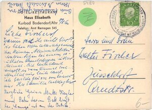 Karte im Querformat und im Bunt-Druck. Die Vorderseite zeigt eine gemaltes Bild vom Haus Elisabeth, so wie es der Maler Gattenburg 1959 in einem Aquarell sah, auf einer Anhöhe stehen. Die Karte wurde von einem Gast beschriftet und nach Düsseldorf geschickt. "Hotel Haus Elisabeth und Gatterburg" Rückseite: Oben links "Hotel - Restaurant Haus Elisabeth Kurbad Bodendorf/Ahr Telefon Amt Remagen 545" Senkrecht "Druck, Buchdruckerei Reinhard Warlich, Ahrweiler"
