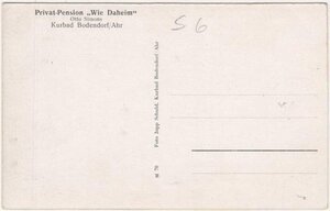 Ansichtskarte im Schwarz-weiß-Druck und glatter Rand. Vorderseite: Zwei Bilder in einem drei mm breiten weißen Rahmen eigefasst. Hauptmotiv Dorfansicht aus dem Ahrtal heraus. Im Hintergrund des Ortes sind Weinberge bis hoch in den Reisberg zu sehen. Im Vordergrund, vor dem Ort rechts etwa im ersten Drittel des Bildes vor Bäumen steht die Dreifaltigkeitskapelle (sie wurde zum Bau der Reichsstraße 1 1941 abgerissen). Links davon das größere Fachwerkgebäude ist der Bahnhof und rechts daneben das dazugehörige Wirtschaftsgebäude mit an Toilettenanlagen. Rechts vor dem Berghang ist die Kirche die Kirche zu sehen. Oben rechts die Außenansicht der Pension "Wie Daheim". Unten links steht "Kurort Bodendorf a. d. Ahr". Rückseite: Oben links "Privat-Pension 'Wie Daheim' / Otto Simons / Kurbad Bodendorf/Ahr". Mittig senkrecht "M 70 - Foto Jupp Schuld, Kurbad Bodendorf/Ahr".