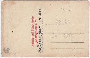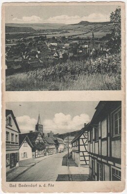 Karte im Querformat mit gewelltem Rand und schwarz-weiß-Druck. Das Bild ist in einen 3 mm breiten weißen Rahmen eingefasst und besteht aus 2 Bildern. Bild oben: Im Vordergrund Weinberge. Der Mittelteil beginnt mit dem Ort, dahinter Blick ins Ahrtal und am Horizont in rechten Bildteil die Landskron bei Bad Neuenahr. Bild unten: zeigt den Ortskern. Im Bild links vorn die Metzgerei Gottschalk. (Die Aufnahme ist vor der Judenvertreibung und Deportation entstanden. Unter dem Bild steht links "Bad Bodendorf a. d. Ahr" Rückseite: Links unten links das Firmenloge vom Ka-Ro-Ba-Ne Verlag. Mittig senkrecht "Ka-Ro-Ba-Ne Verlag, Bad Neuenahr"