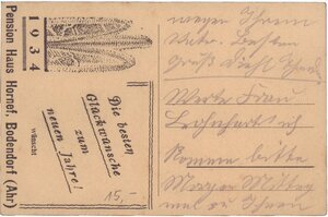 Karte im Querformat und im SW-Druck. Die Vorderseite in zeigt den Ortseingang beim Bahnübergang am Bahnhof aus Aufgenommen, wie er 1934 aussah. Auf der Giebelseite links befindet sich die Werbung für Bodendorfer Thermalsprudel. Vor dem Bahnübergang kommt ein Auto Richtung Ort gefahren. Die Karte ist rückseitig von einem Neujahrsgruß und der Einladung zum Besuch Mittagessen beschrieben. Über der Zahl 1934 ist ein sprudelnder Brunnen gezeichnet.